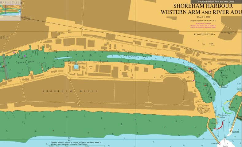 Shoreham port sits at the mouth of the river Adur in West Sussex. It is a location that has had a working port sited in the area for many hundreds of years (Baggs et al, 1980). Because of the requirement to maintain a working depth of water for vessels to access the port (Image 3), historical attempts to manage the river channel have produced the present format of the port and coastline (Image 2) (Pritchard, 1843: Kleinhans et al, 2010). Consistent and extensive building of a shingle bar from the effects of longshore drift (Bird, 2008) produced what is now Shoreham Beach, and the present location of the river mouth.