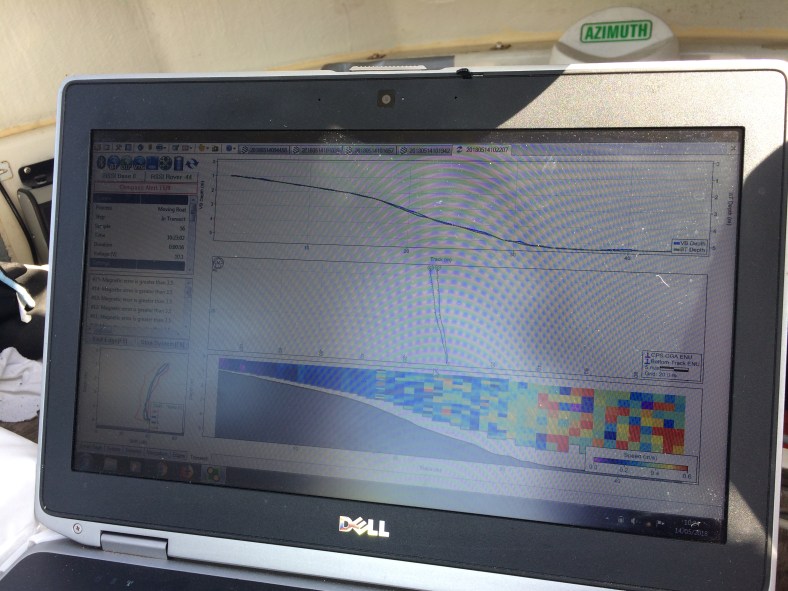 Acoustic Doppler Current Profilers (ADCP) are an amazing (and expensive) piece of kit. Mounted on to a float in this case, the unit works by sending acoustic ‘pings’ through the water, and then records the echoes that rebound off the sediment and other objects suspended in the water. The clever part of the ADCP is in its ability to identify not only the presence of items in the water, but also the direction that the water is flowing in down through the water column to the riverbed, as well as the speed at which the water is flowing. When linked to the differential GPS (dGPS) system built in to the unit (and a static GPS base station of the river bank) you can then see a cross-section of the river and identify exactly what is happening below the surface.