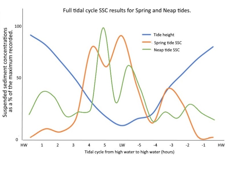 Data sets produced from a complete tidal cycle show a clearly defined and significant increase in SSC during the middle to later sections of the ebb tide. These spikes in SSC were almost identical during both Spring and Neap tides, also, high water slack tide and the flood tide both showed very reduced SSC levels.