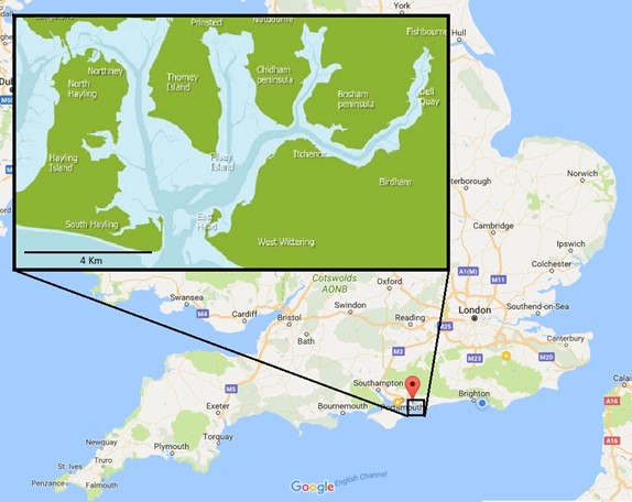 Figure 1. East Head, at the Eastern edge of the entrance to Chichester harbour and its location within the United Kingdom. Source: modified from Bray, 2010 and Google Maps.