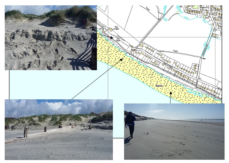 Figure 17. ‘The Hinge’ with photos (clockwise from top right): upper beach area showing increasing gravel content; recent defences to combat aeolian transported sand; historic sea defences (groynes) increasingly exposed, with increased gravel content; perpendicular sea defences destroyed exposing the soil matrix of the area landward. Source: Base map – Ordinance Survey; Photos, S. Hall.