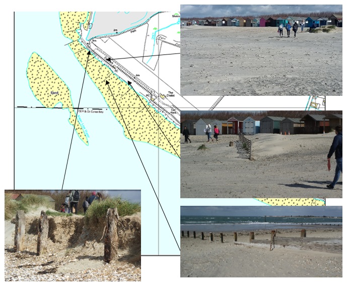 Figure 16. West Wittering Beach with photos (clockwise from top left): sand dune face showing deposition stratification and current erosion; extensive intertidal, gently sloping sandy beach; historic sea defences (groynes) inundated, and recent fencing-off to protect dune vegetation. Source: Base map – Ordinance Survey; Photos, S. Hall.