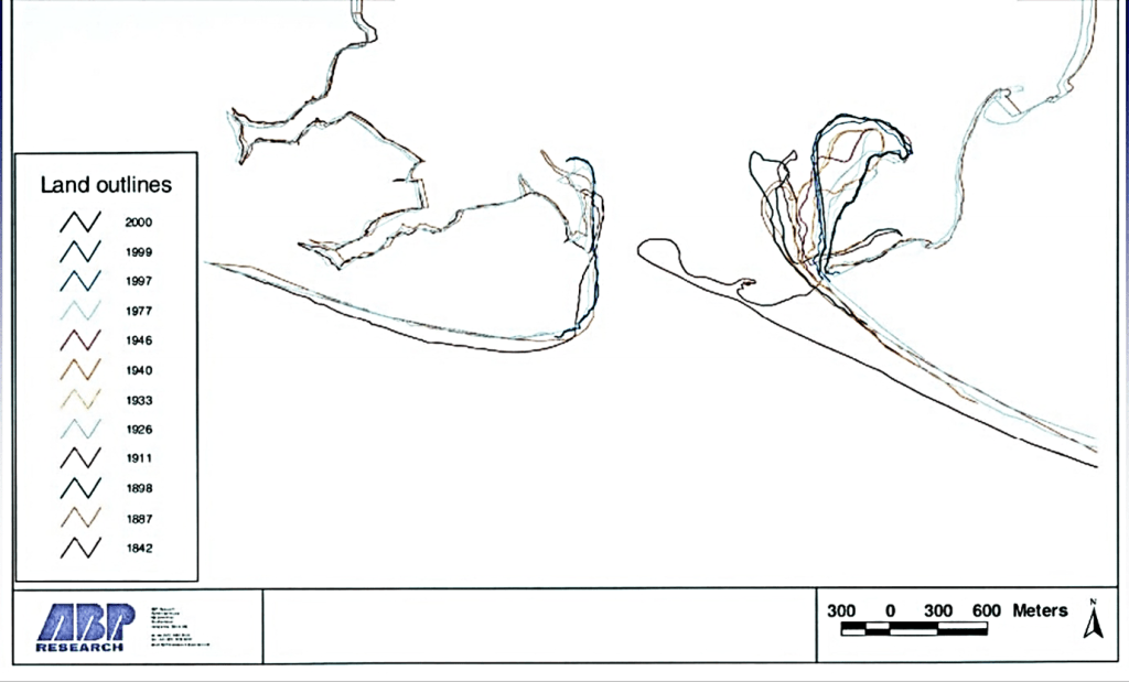 The entrance to an historic port, the area has been mapped extensively in the past with their accuracy being examined in previous papers (Carr, 1980: de Boer and Carr, 1969), and methods developed to reduce inaccuracies (Thieler and Danforth, 1995), but the quality of the expertise and equipment available must always be borne in mind. Early maps of the area date back to 1585 (Figure 2), but Yeakell and Gardner in 1778 (Figure 3) show a tremendous improvement in the definition of features, with a clear recurve feature present in the drawing and a general alignment of NW to SE orientation for the spit.