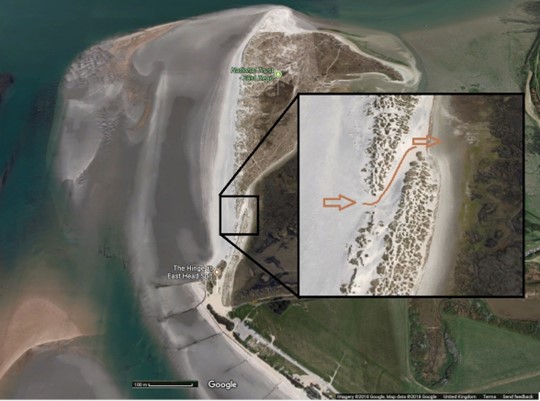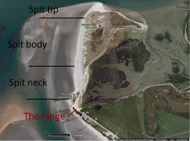 Northward from the hinge, the spit can be described in three distinct zones: spit neck, body and tip (Figure 20). With a marked change in beach material apparent as you head away from the hinge, the dominance of shingle is replaced by sand, as the alignment of the beach changes dramatically.
