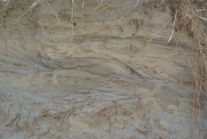 Figure 21. Eroded face of sand dunes – spit body area, with the box showing stratification of the sand. Source S.Hall.