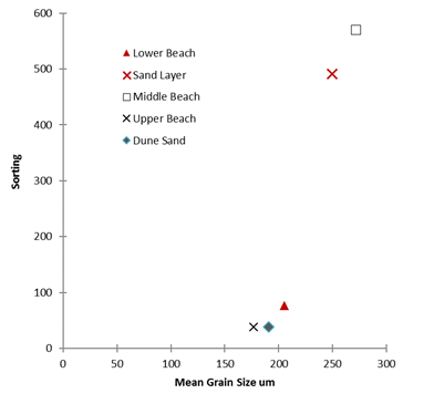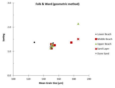 Analysis of the data using the Folk & Ward geometric method produces data that implies sources for the sand layer being from the middle beach and dune sand (Figure 28), but when compared to data from previous surveys the data implies middle and upper beach sources.